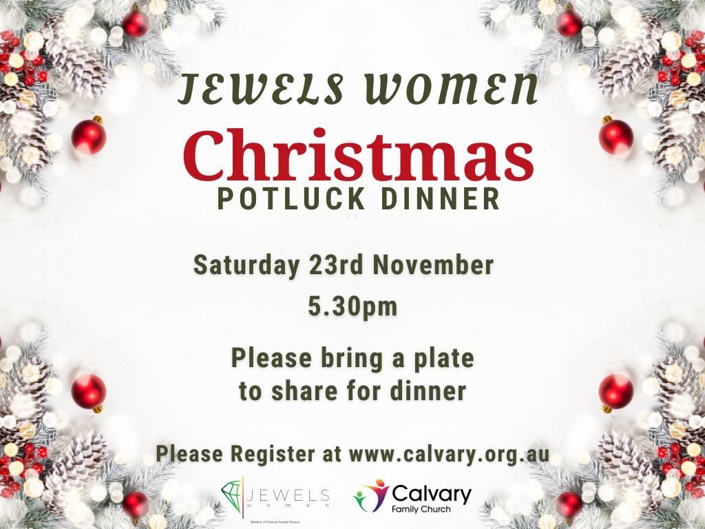 Jewels Women Christmas Potluck Dinner23 November 2024 5:30 pm 373 – 379 Chatswood Road Shailer Park 4128 Calvary Family Church Directions Register