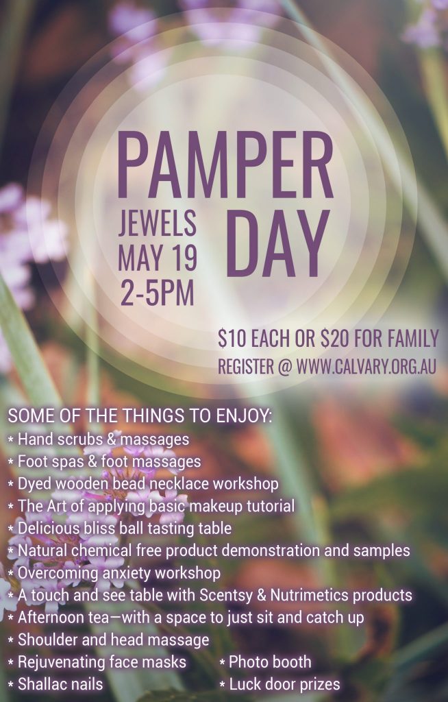 Women’s Ministry – Pamper Day19 May 2018 2:00 pm – 5:00 pm 373 – 379 Chatswood Road Shailer Park 4128 Calvary Family Church Directions Register Come and enjoy an afternoon of pampering, demonstrations and Devonshire tea.Adult Tickets (16+) – $10Family Tickets (Mother and Daughters) – $20